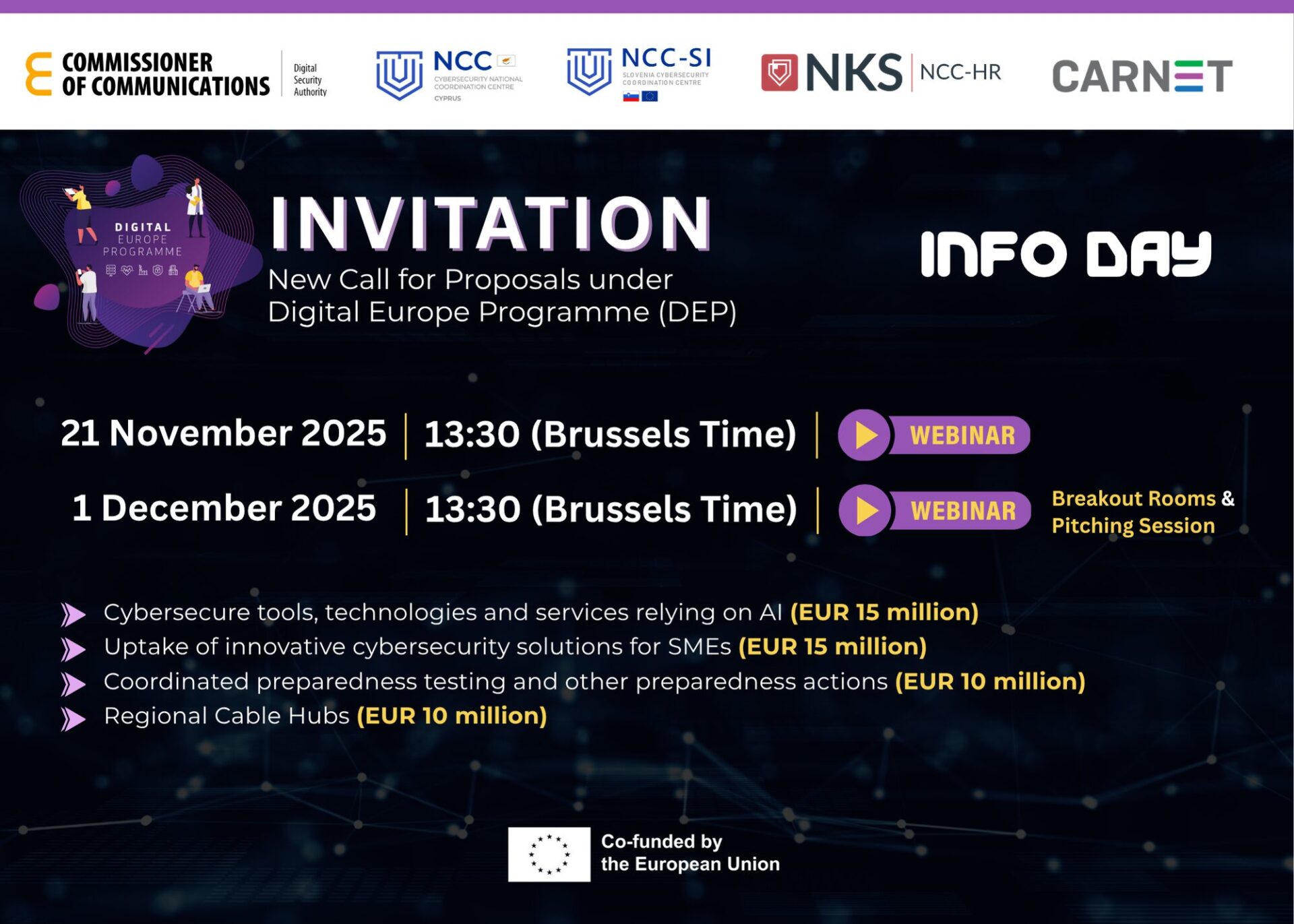 Drugi dio Info dana za poziv CYBER 09 u okviru programa Digitalna Europa održan je 1. prosinca 2025. godine i okupio je oko 65 sudionika iz Hrvatske, Slovenije, Cipra i...
